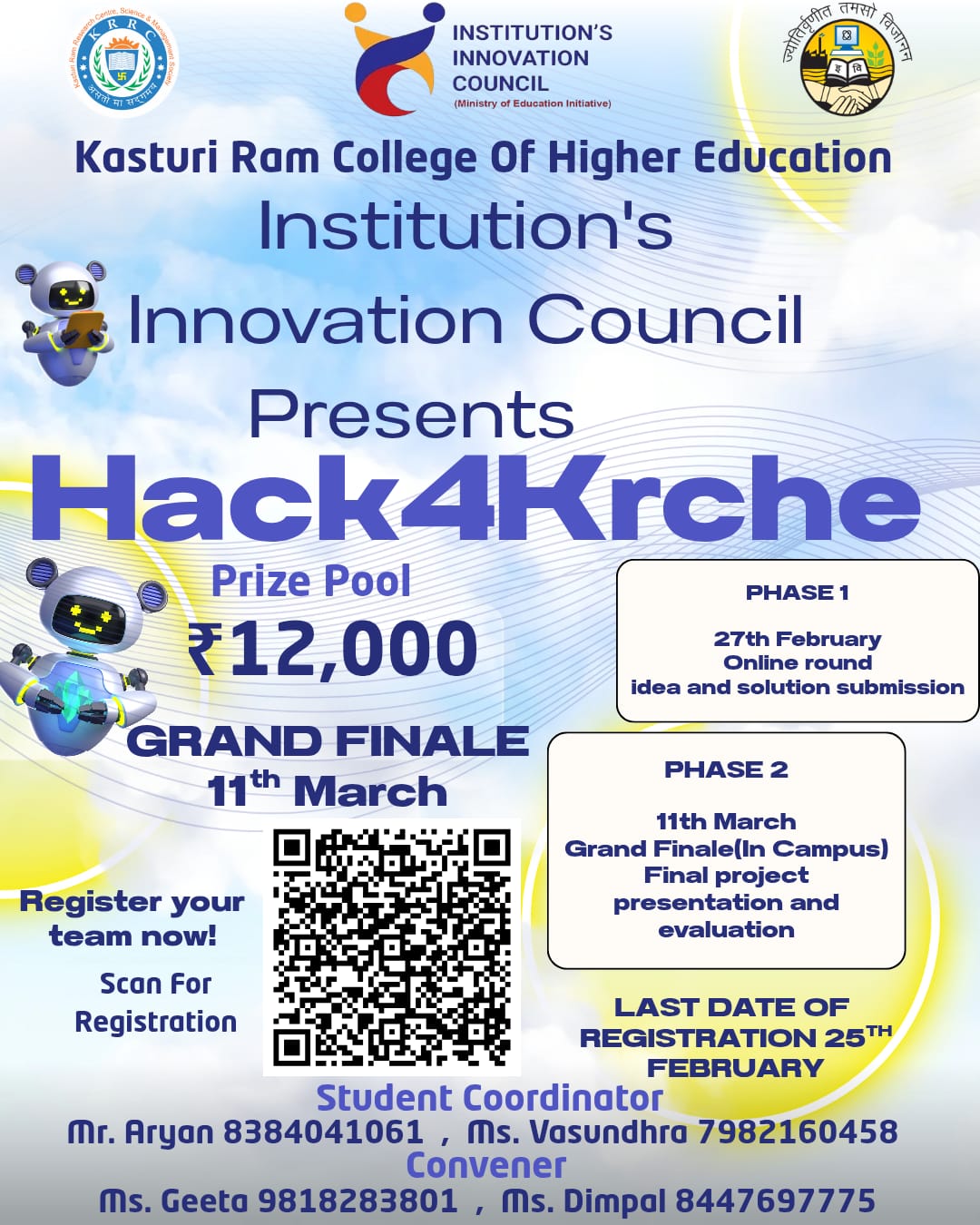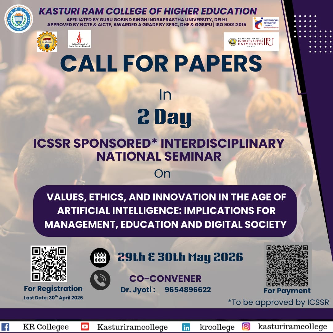 Kasturi Ram College of Higher Education (KRCHE), Narela cordially invites Academicians, Scholars, Researchers, and Industry professionals to participate in the National Conference on "Future Ready Curricula: Integrating AI and Thrust Technology" in Collaboration with GGSIPU
